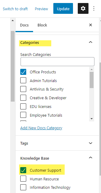 Bitte beachte, die richtige Kategorie und Knowledge Base anzugeben: