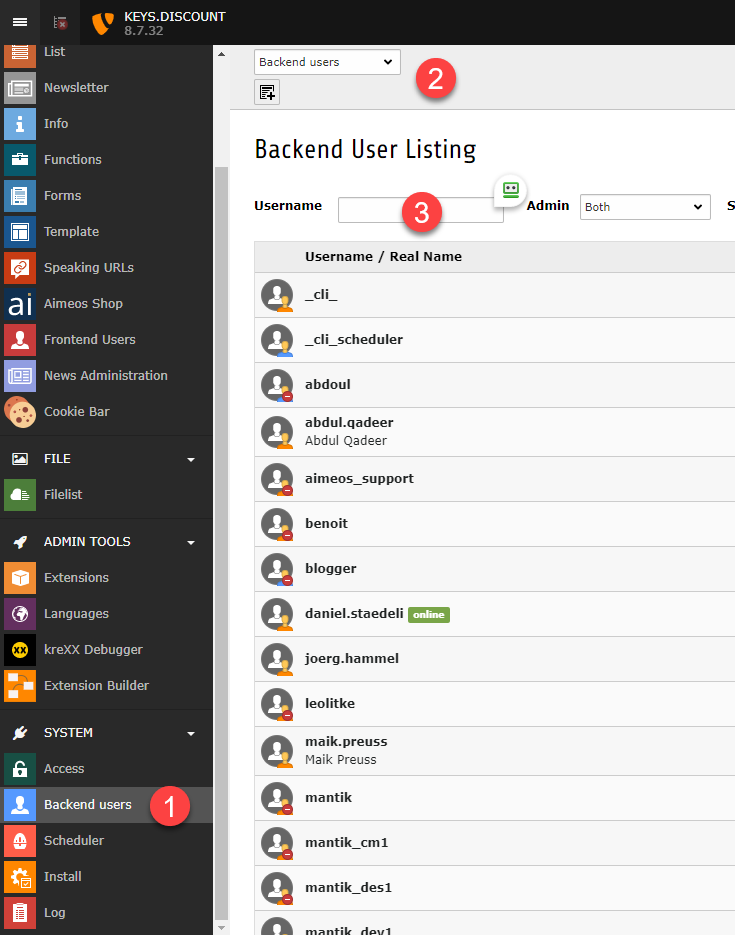 In the Typo3 backend go to (1) Backend Users > Select Backend Users (2) and search for the user (3) you want to find.