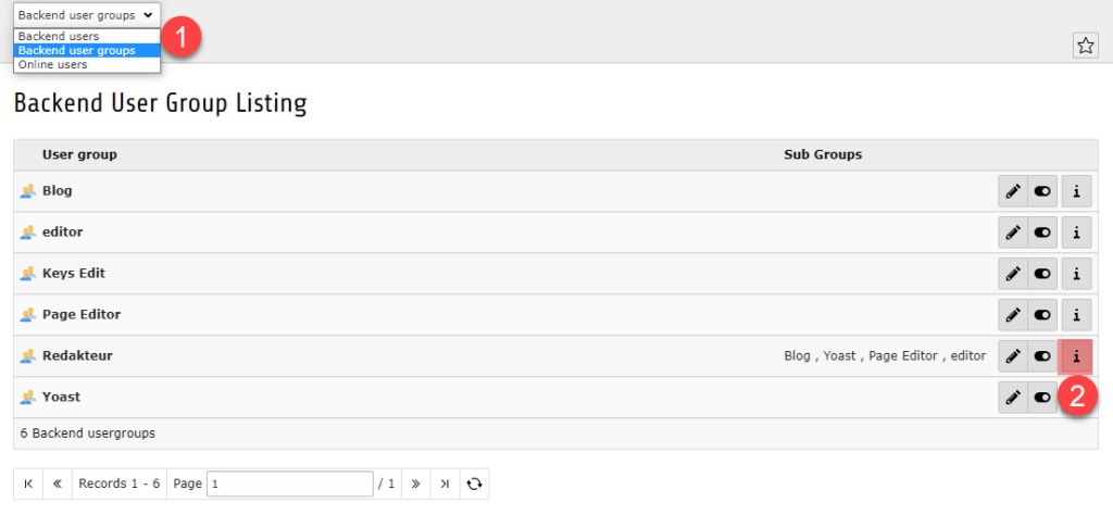To manage Backend User Groups, select Backend user groups (1) and open the group you want to edit. Use the information icon (2) to see more information on this role.