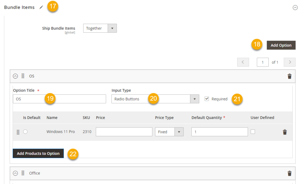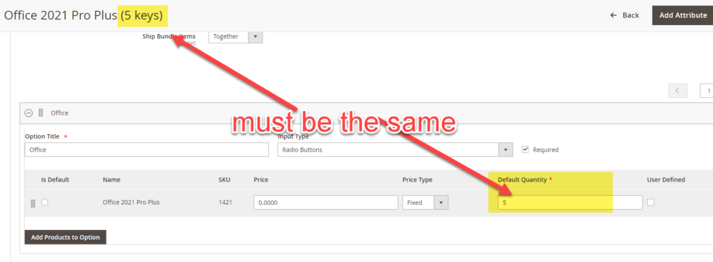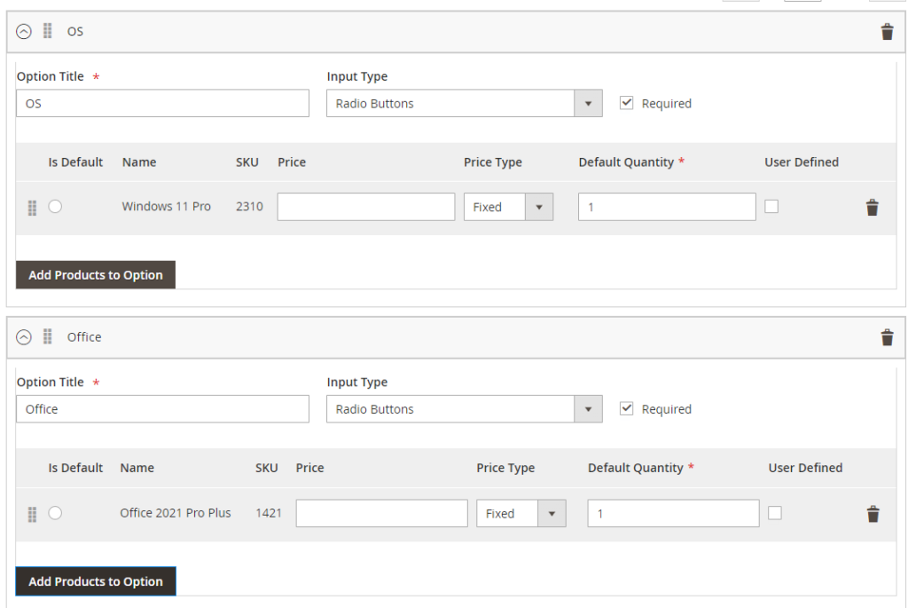 This is how the Bundle items section should look like before you go on. The Default Quantity needs to be 1 and 1.