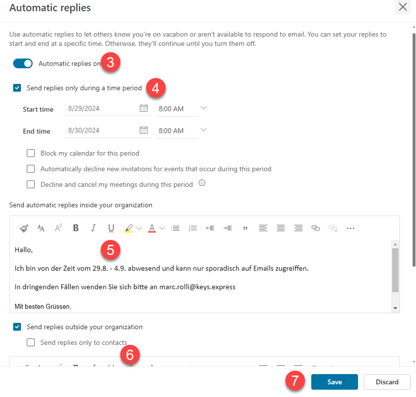 5. Set a message for your colleagues that email you from a keys.express domain