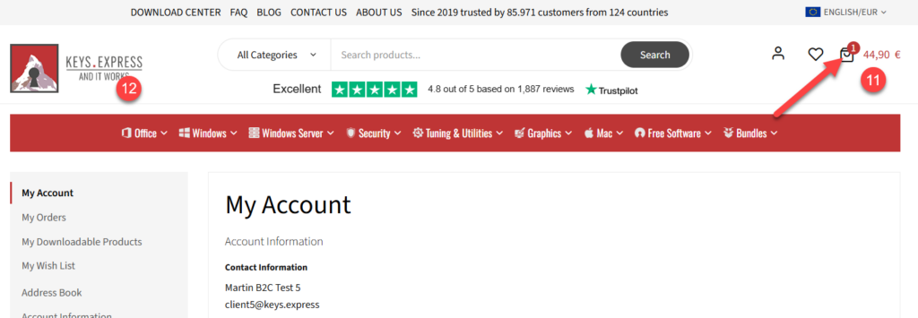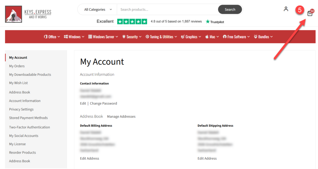 5. After successfully logging in, you will see your Account. You can then click on the shopping cart icon to complete your order.