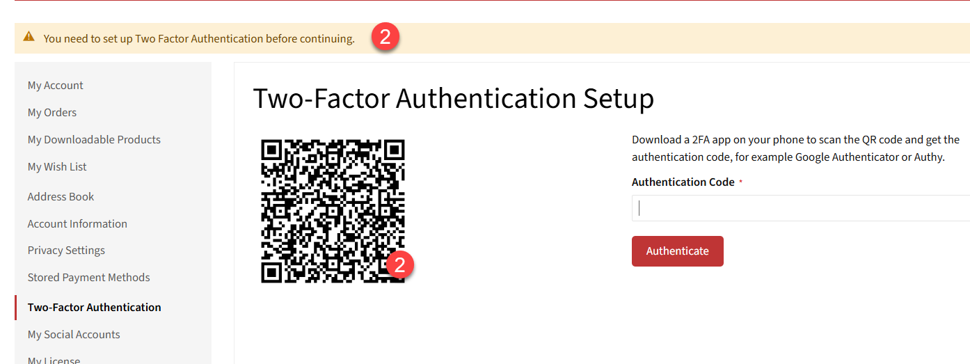 2. The first time when you login, you will see a message banner, alerting you about the Two-Factor Authentication and a QR Code that you need to scan with your authenticator app:
