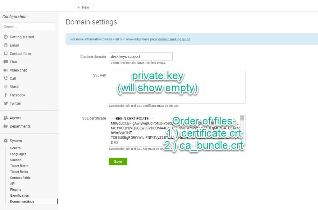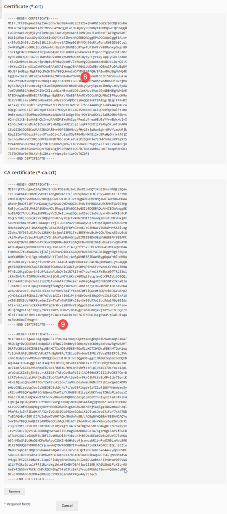 9. Copy the CA certificate (*-ca.crt) and past it to LiveAgent below (8) NEW: this is now only 1x section, not a double section