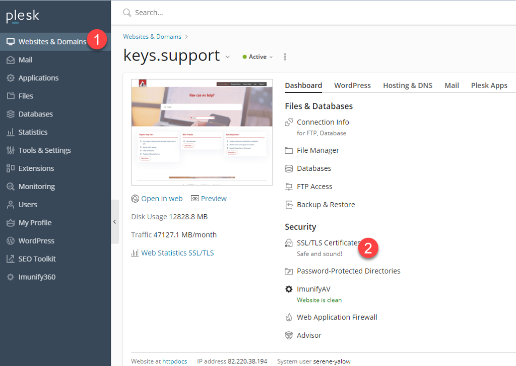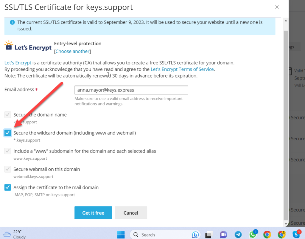 Issue/renew the Let’s Encrypt wildcard cer1tificate in Plesk (Hosttech.ch) account (https://34753.hostserv.eu/)