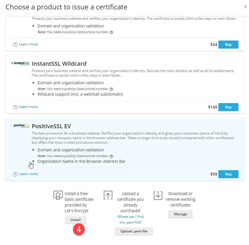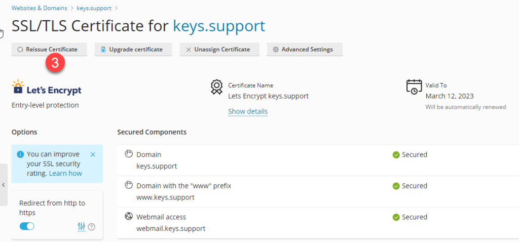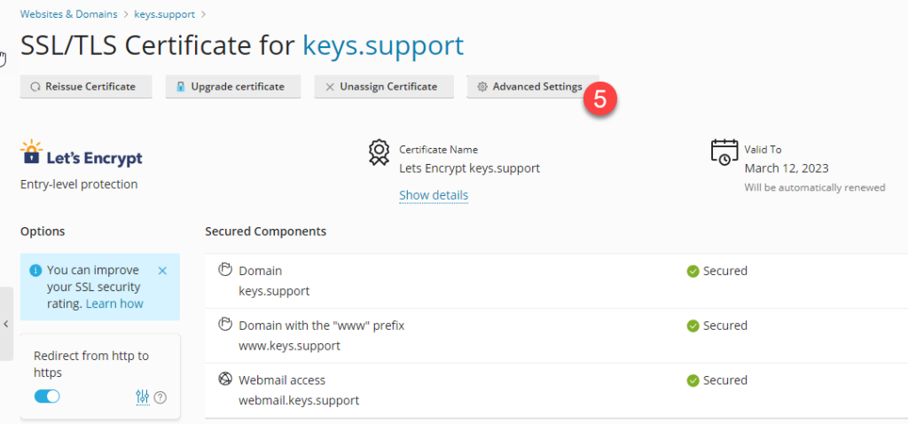 4. at the bottom, click on Install a free basic certificate provided by Let’s Encrypt