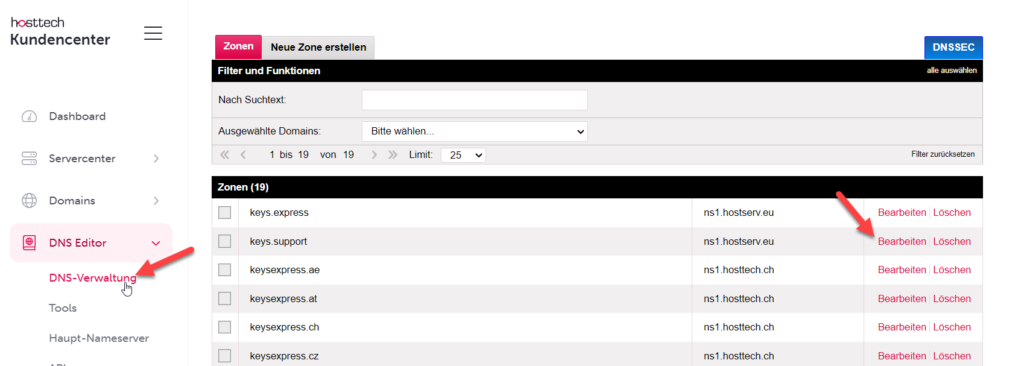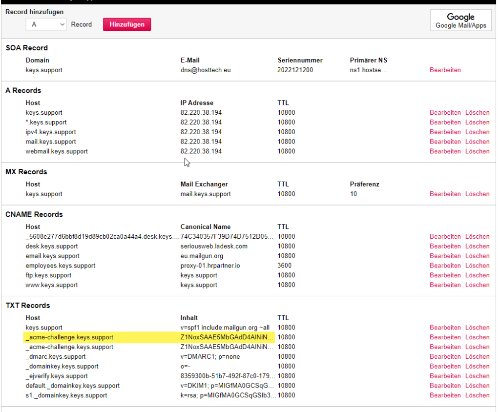 To add the record to the DNS, login to hosttech.ch (username daniel.stadeli@keys.discount) and go to DNS Editor >DNS-Verwaltung > keys.support > Bearbeiten (edit)