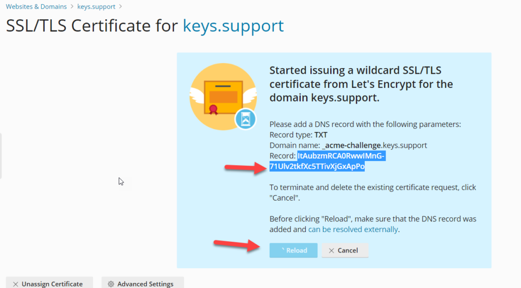 You will be asked to authenticate ownership of the domain. Copy the record code and wait before clicking Reload, until you have completed the next step.