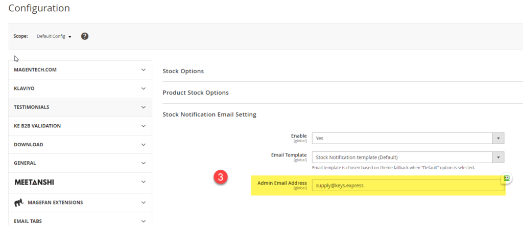 3. Go to Stores > Configuration > Catalog > Inventory > Stock Notification Email Setting and list the email under Admin Email Address