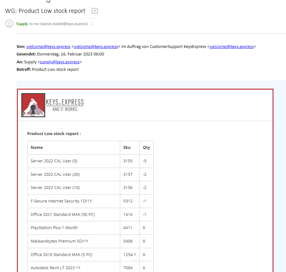 We have an email report that lists all the products that fall below a pre-defined stock level.