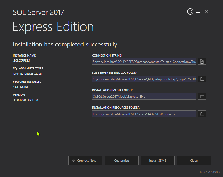 SQL SERVER INSTALL LOG FOLDER C:\Program Files\Microsoft SQL Server\140\Setup Bootstrap\Log\20250107_085359